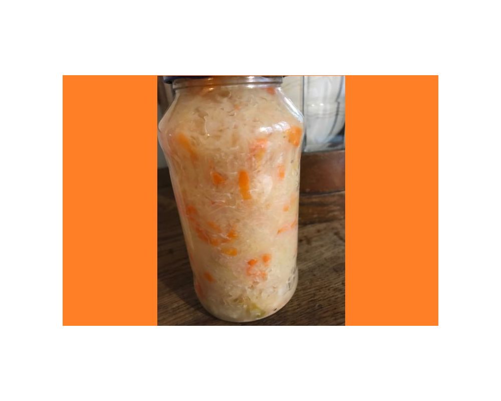 Kapusta z dodatkiem ekologicznej marchewki. Kiszona w beczce, przekładana do słoików, niepasteryzowana. Sprzedawana na szt. po 0,7 l.